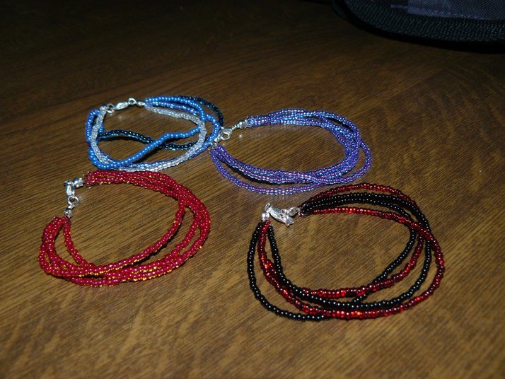 sada jednoduchých náramků, spočívá v navléknutí 3 řad rokajlu, každá na jednotlivém vlasci a zakomponovaný do jednoho. zapínání na karabinku