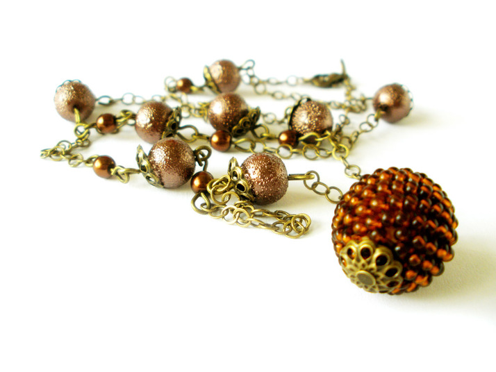 náhrdelník ze staromosazného řetízku mm čokoládových a 8mm kakaových vroubkovaných perliček dozdobené staromosaznými kaplíky 6mm, jako přívěsek zvolena dřevěná kulička obšitá hnědým rokajlem 10/0, zapínání na karabinku, dělka cca 60 cm