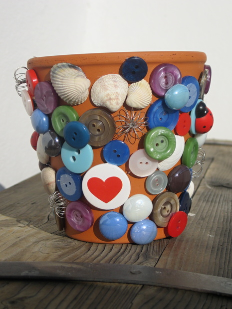 hliněný květináč, zdobený knoflíky, mušličkami, lesklými kamínky a dalšími drobnými předměty