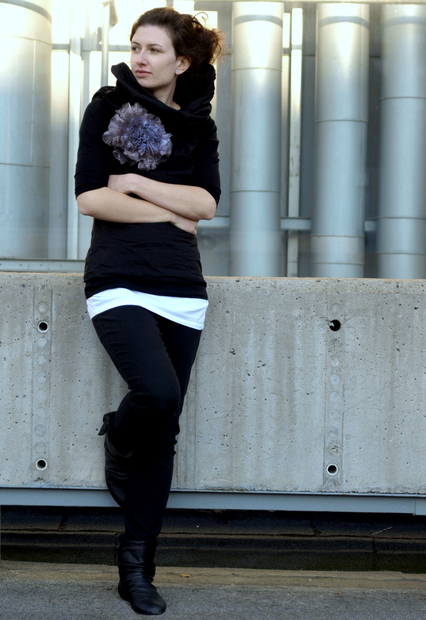 Jednotlivé kousky kompletu pocházejí z konfekčních řetězců, osobitost zaručuje výrazný autorský doplněk - brož. Převládající černou oživují detaily v kontrastní barevnosti, jednoduchou linii zase vrstvení a řasení.