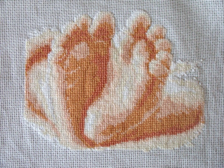Nožičky jsou vyšívané křížkovým stehem na bílé Aidě 18 (7křížků na 1 cm). Velikost výšivky je 14 x 12 cm