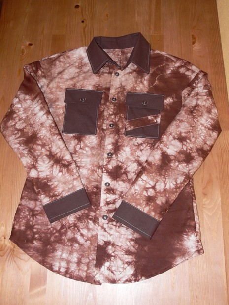 Košile z přetvořených mamčiných šatů, ručně batikovaných.Dala mi tak zabrat, že jsem si ji nakonec nechala :o)