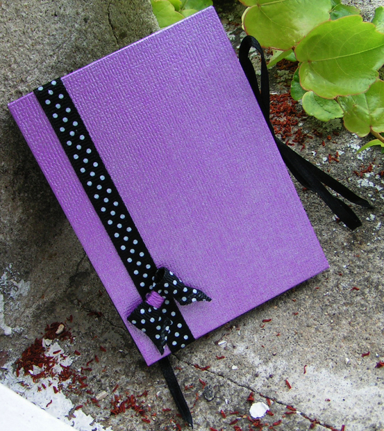 velikost cca A7, přední desky potažené strukturovaným fialovým papírem s perleťovým povrchem, zdobeno černou stužkou s puntíky a mašličkou, zadní strana černá, 60 bílých nelinkovaných listů, uvnitř fialová stužka jako záložka, dvě fialové stužky na svázání desek