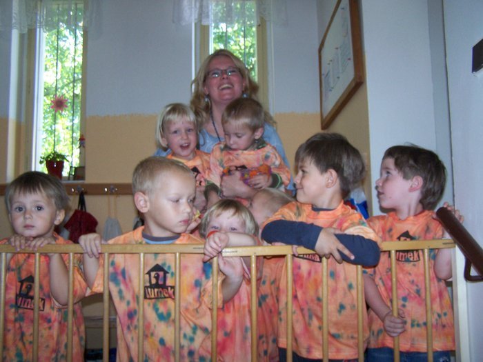 Logo těchto triček není mým výtvorem, pouze nápad obarvit trika a navléknout je na všechny děti dětského klubu, abychom je všechny posbírali a hlavně rozeznali na dětském hřišti od ostatních :-).
