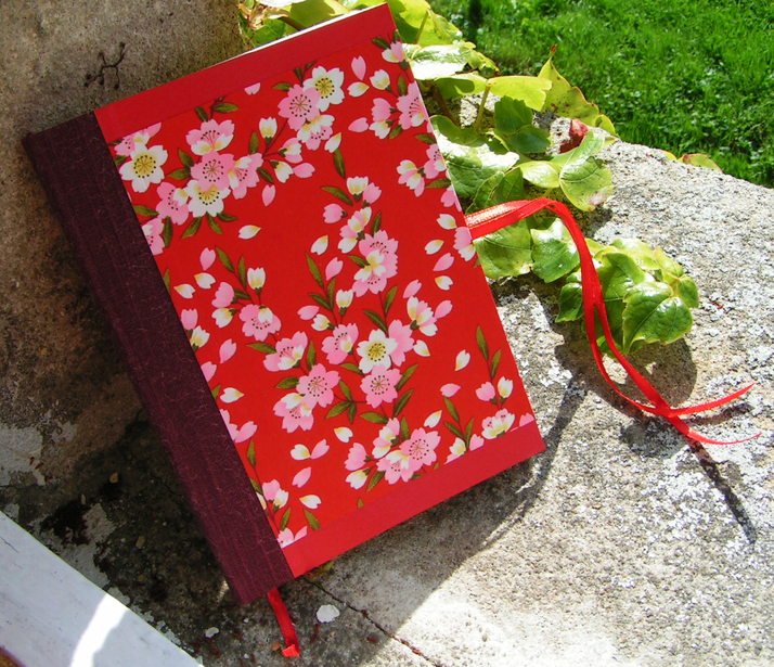 velikost A6, hřbet v plátně, přední desky zdobené originálním yuzen washi papírem, zadní desky potažené červeným papírem, dvě stužky na svázání desek, jedna stužka jako záložka