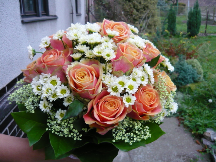 Kulatá svatební kytička z růží a santinek.