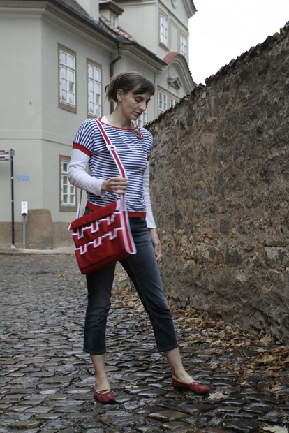 Můj fler fight. Romantická ulička, kapsářka na rameni a listí na zemi. Triko stromli,brož a taška Kapsářka bara S.