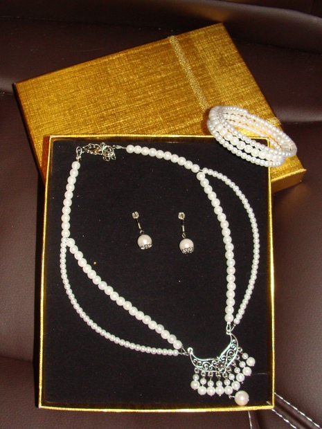 Set náušnic, náhrdelníku a náramku z bílých skleněných voskovaných perliček. Vyroben na zakázku - dárek pro odcházející kolegyni.