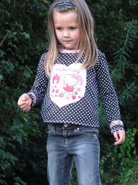 tato mikinka ušita z černobíle tečkovaného úpletu,kolem krku pak světle růžový úplet a kolem rukávů v oblasti nad zápěstím,našita světle růžová stuha s dekorem růží...to je vše z nových látek...na přední straně mikinky je našito srdce s motivem hellokitty ze starého trika,které bylo už malé a místy nevypratelně unavené a takhle hezky využito...našito overlockovým pružným stehem-entlovacím....nejsem majitelem overloku,ale jak vidno šiju z pružného materiálu i pro svou rodinu a vše vždy pečlivě začistím a prošiju overlokovými stehy a myslím ,že je to dostatečně spolehlivé