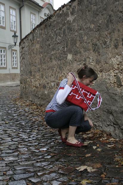 Romantická ulička, kapsářka na rameni a listí na zemi
