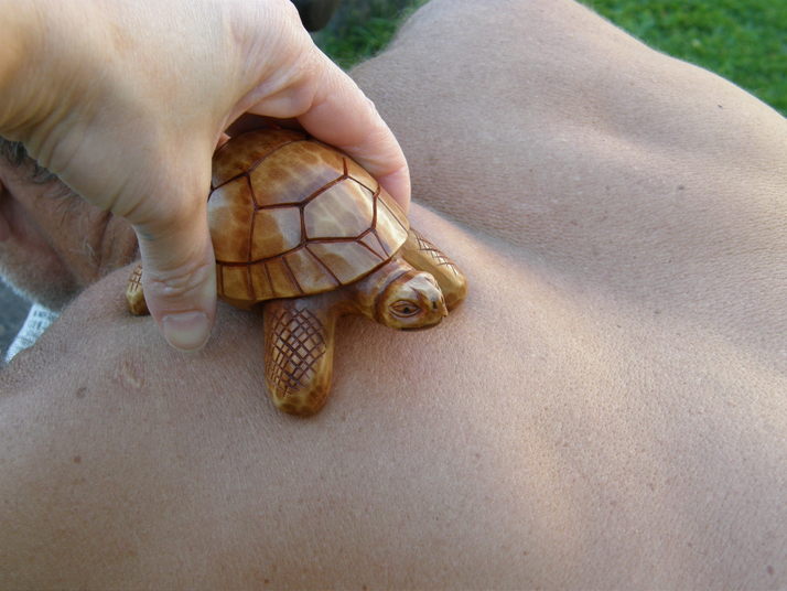 Takto se želva uchopí a masíruje se naše tělo nohama želvy. Možno i ocasem či hlavou ... Želva pasuje do dlaně ruky.