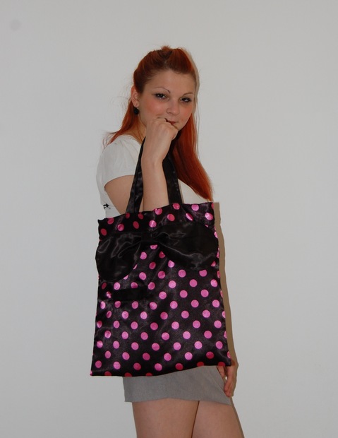 Puntíkatá retro taštička se saténovou mašlí, vpředu kapsička se saténovou manžetou, vypodšívkovaná, uvnitř kapsička na zip, cena 290 Kč