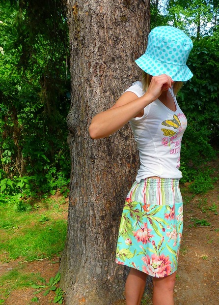 Ušito z látek Bliss Bouquet od Amy Butler a SLim Dandy od Heather Bailey. V pase na 3 gumičkové tunýlky.