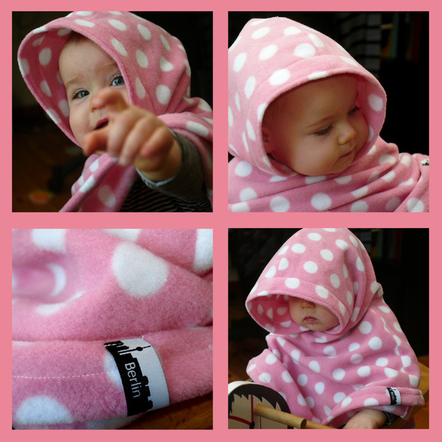 Ušít tohle malé pončo mě napadlo, když jsem potřebovala dceři zahalit horní část těla, které kouká z fusaku z kočárku. Funguje vlastně jako velká šála či nákrčník.