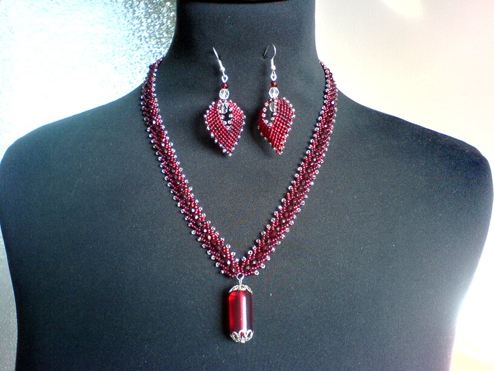 Šitý náhrdelník a náušnice z rokajlu a broušených korálků rubínové barvy, doplněno běžnými bižuterními komponenty