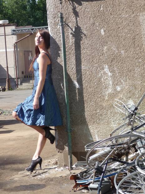 Modré taftové šaty S (prsa 80 cm, pas 74 cm, délka 67 cm) skrytá ramínka možno použít . S aplikacemi s korálků, mačkaný efekt. Originál - pouze jeden kus.