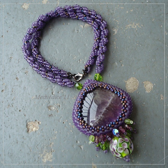 opět nic světoborného, jen obyč obšitý kabošon ametystus ohňovkovým třásněním a krásnou vinutkou od cat :) pro sestru na přání