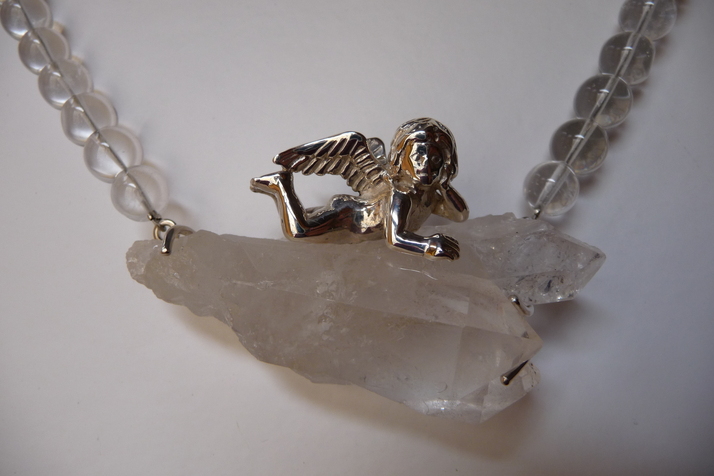 Další můj osobní šperk.Je to anděl Strážný na křišťálovém krystalu se stříbrem a krásně čistými kuličkami křišťálu.A i když je to docela velký šperk,nosí se krásně.Vždycky přitahuje pozornost a lidé z něho nemohou spustit oči.Pokud se Vám líbí, je ho možné dodělat na zakázku.