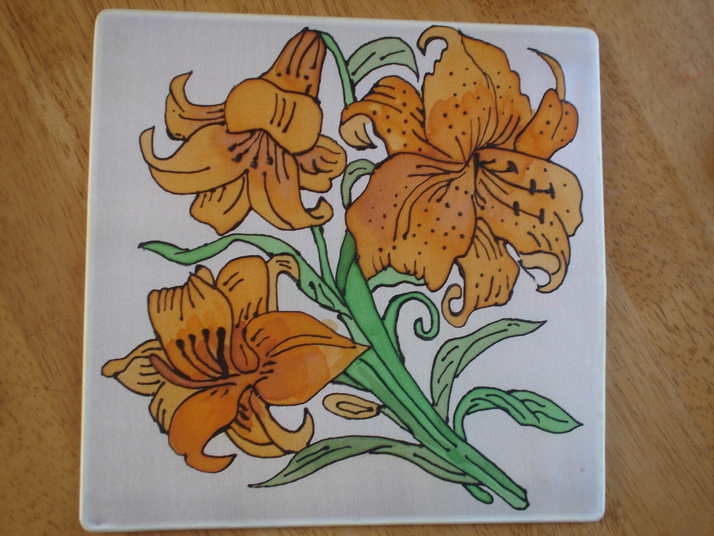 Tyto lilie malované na hedvábí mají ještě dvojče v podobě pouzdra na brýle.