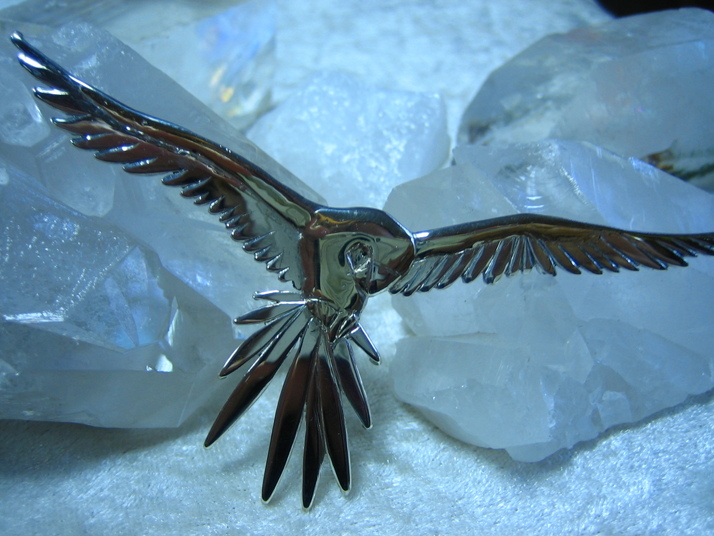 Stříbrný přívěs ve tvaru papušky Ara za letu. Přívěs je poměrně velký, rozhodně je nepřehlédnutelný.