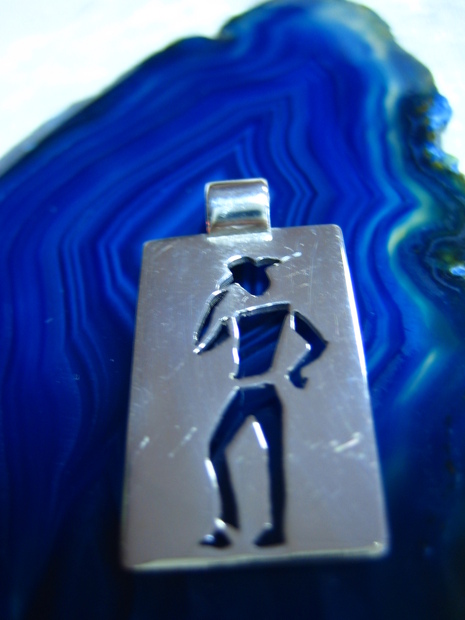 Stříbrný přívěs je klasická práce, kde hlavní motiv je vytvořen technikou vyřezávání, velmi efektivní metodou. Mnohem častější je technika rytí, ale vyřezání vypadá neokoukaně.