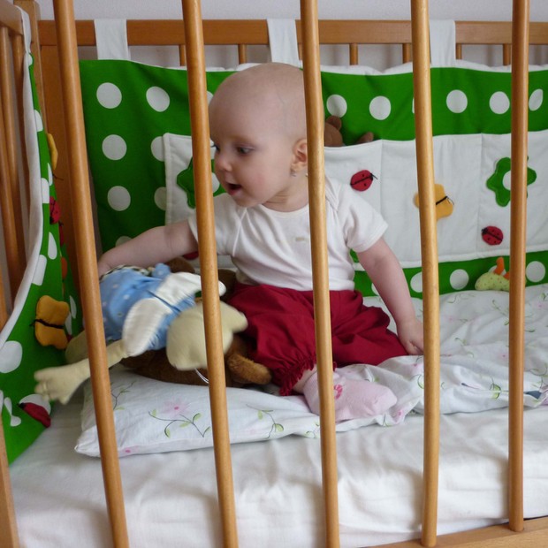 Jelikož je kapsář ze dvou stran postýlky, bylo nutné ještě doplnit část pohledovou od dveří. Tento kus je trojúhelníkového tvaru, aby mělo dítě přehled. Také je vyzdoben beruškami a motýlky, ale neslouží jako kapsář.