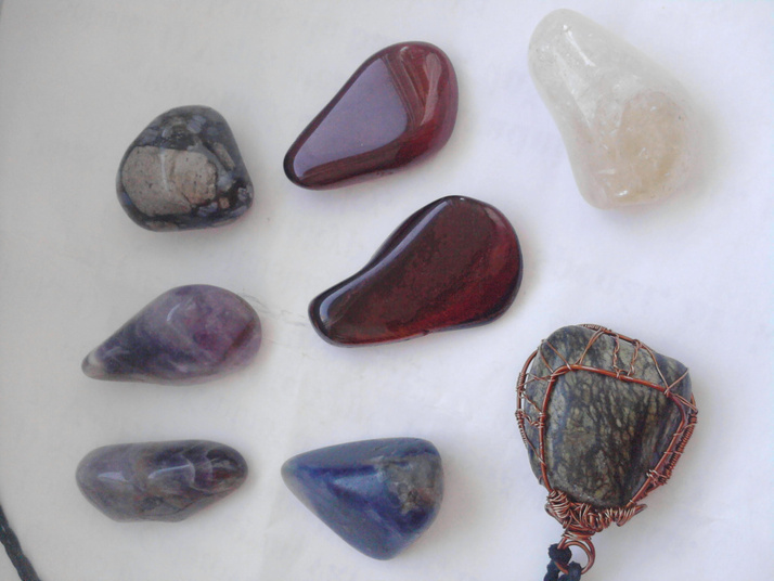 býčí oko 2x, přepalovaný ametyst, ametyst 2x, serpentinit, llanit a sodalit