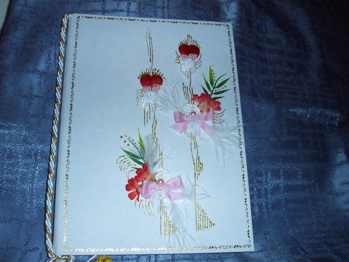 Tak takhle vypadají desky-přání pro moje milé lidičky. které mám moc ráda .Jsou individuální pro každého jiné zdobení, na obou stranách mají růžky a v nich je zasunutý kladívkový karton s mými veršíky-skládání je moje slabost.Verše jsou vždy sestaveny tak ,aby se dotýkaly konkrétní osoby a podle přání toho kdo si je objednává…….ukázky zde neuvidíte –verše jsou osobní a nikdy se neopakují.