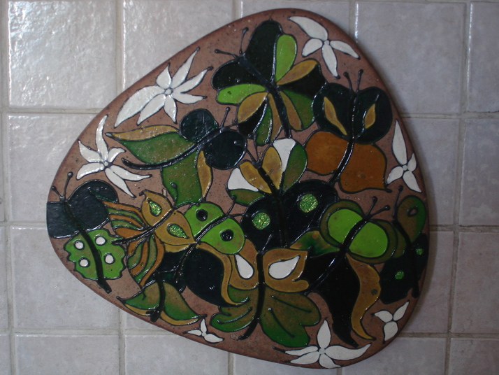 Keramický nášlap vyhotovený technikou malby na keramiku, vyrobený na zakázku jako dekorace kuchyňské linky