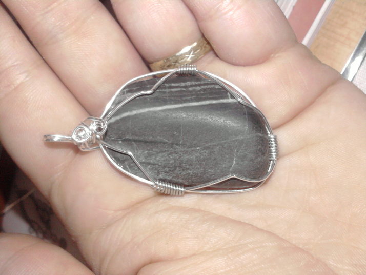 břidličný kamínek-placáček v klícce z postříbřeného drátku