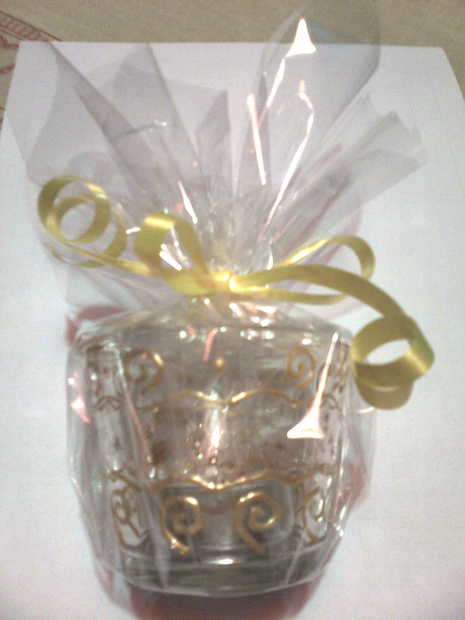 Ručně malovaný skleněný svícen se zlatými ornamenty,s čajovou svíčkou,v celofánu se stuhou.
