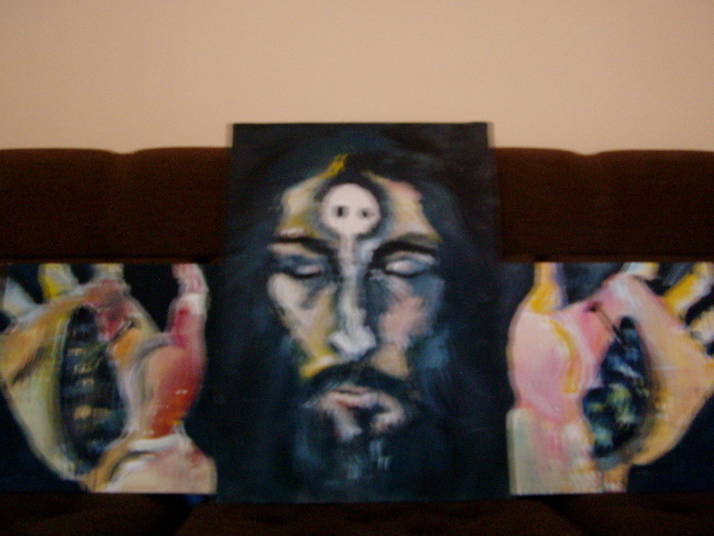 Ježíš šíře 49cm x výška 69cm,ruce š.40cm x v.40cm,technika balakryl,malba na plátně,dřevěný rám,cena 2500kč
