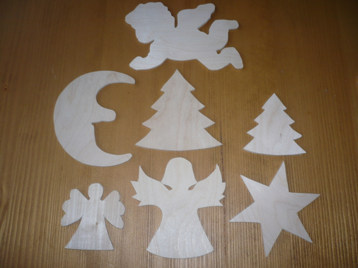vánoční dekorace vyřezané z překližky určené k domalování k dekoracím apod.