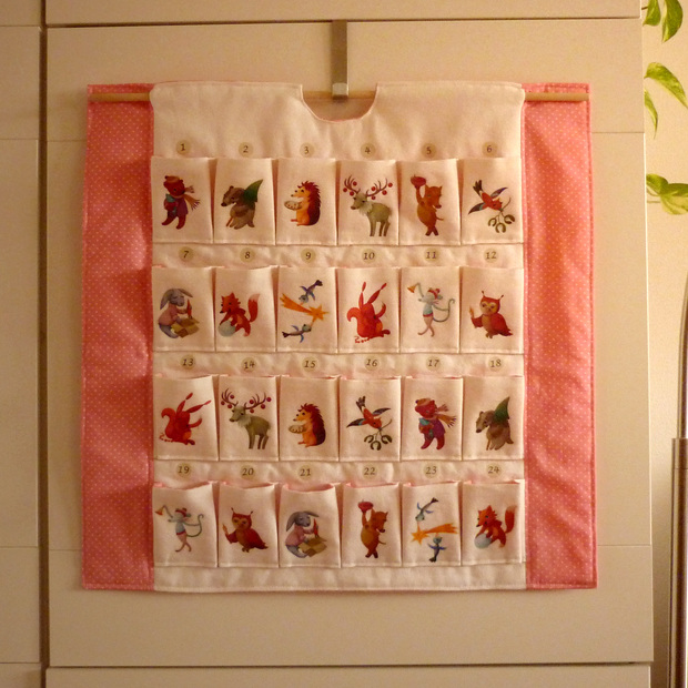 Kapsičky adventního kalendáře jsou vypodšívkované růžovou látkou a tvar mu dalo umístění na čtvercovou skříňku a obdélník s kapsičkami s ilustracemi doplnily po stranách proužky z růžové látky. Zavešení je klasicky na dřevenou tyčku, aby se kalendář nikde neprověšoval a byl zavěšený jen v jednom místě.