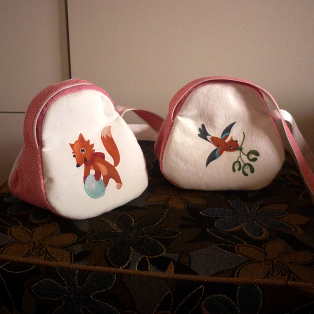 Po dlouhým ročním rozhodováním jsem se odhodlala zkusit nažehlovačky od "Amélky". Kabelky jsou určené pro holčičky, takže jsem je doplnila růžovou látkou s puntíkem od "U Madlenky švadlenky" a podklad tvoří Lenda z "Ikei", kterou na šité dekorace dávám v první řadě. Střih jsem našla u "Bellet".