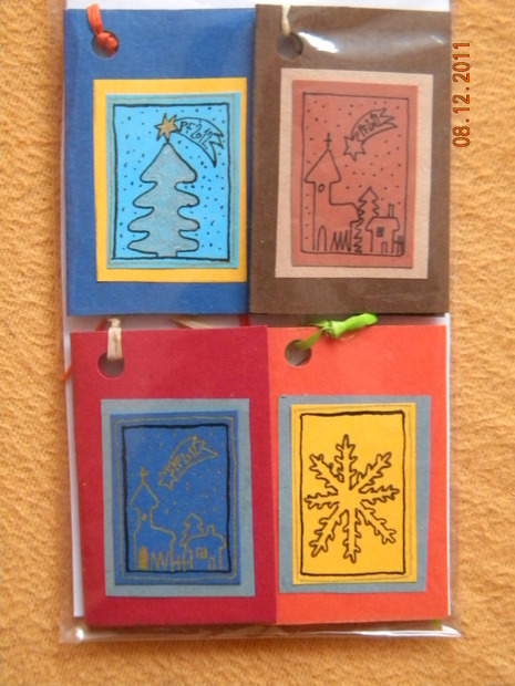 Jmenovky k dárkům jsou tvořeny z tvrdé barevné čtvrtky.