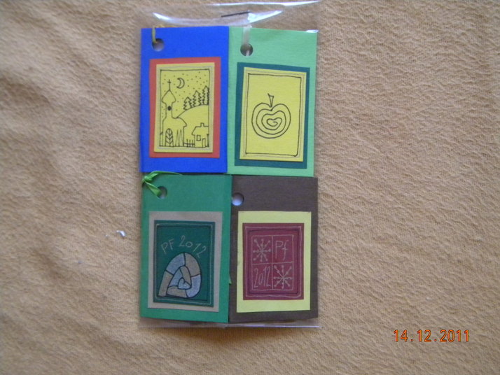 Jmenovky k dárkům jsou tvořeny z tvrdé barevné čtvrtky.