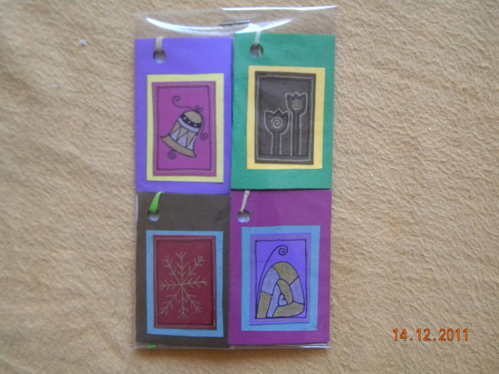Jmenovky k dárkům jsou tvořeny z tvrdé barevné čtvrtky.