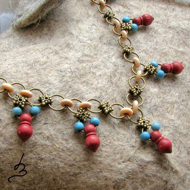 Náhrdelník z kolekce Annelida vytvořený ze dřevěných korálků a starozlatých komponentů.