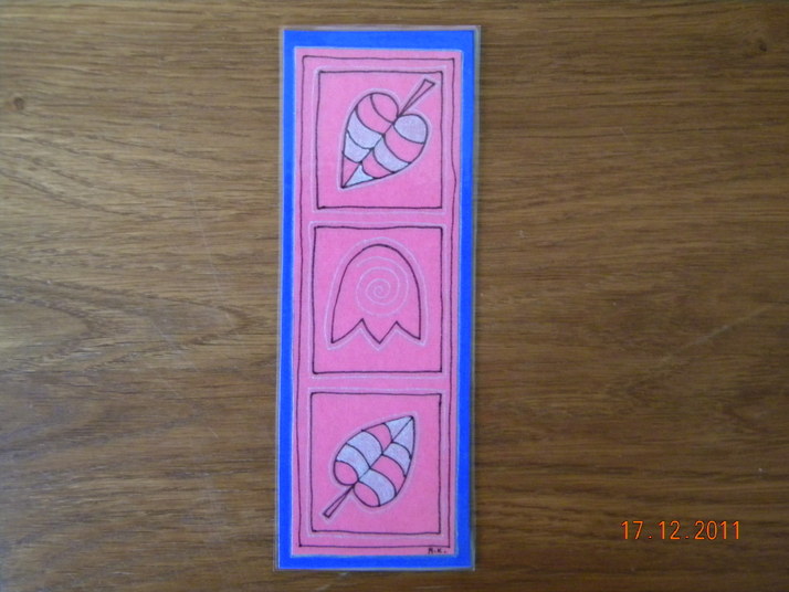 Záložka je vyrobena z barevného papíru a čtvrtky.Malovaná tuší,temperou či ,gelovým perem.
