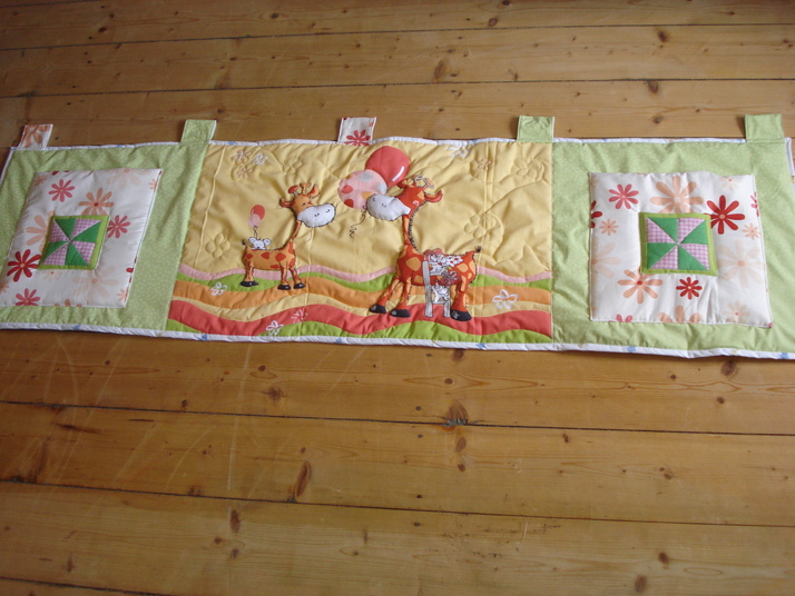 Tento úžasný kapsář se 2m dlouhý a 70cm vysoký na zavěšení za postel,má čtyři kapsy a uprostřed plastické žirafy.Pratelný na 30stupnů i v pračce.