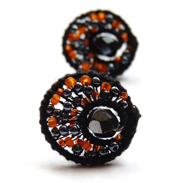 Drobné puzetové nadyrhané naušnice, v centru ohňovka hematitové barvy i úpravy.