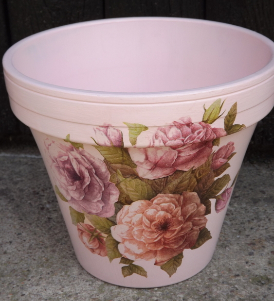 Velký růžovou-krémový květináč s motivem kytice růží na obou stranách. Průměr 22cm.Barvený a lakovaný i uvnitř.Omyvatelný