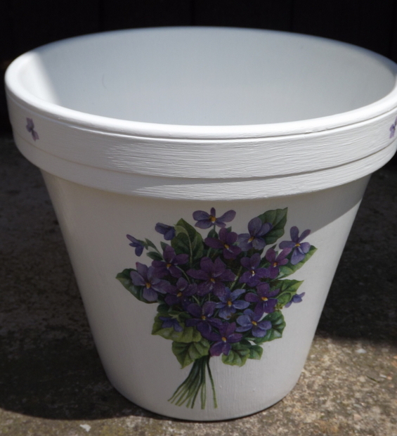 Velký bilý květináč s motivem fialek.Kytice fialek i na druhé straně. Průměr 22cm.Barvený a lakovaný i uvnitř.Omyvatelný