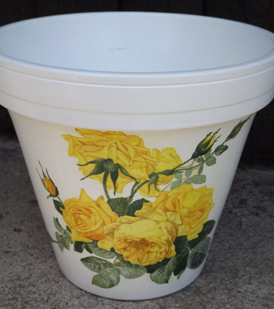 Velký bílý květináč s motivem žlutých růží z obou stran.Barvený a lakovaný i uvnitř. Průměr 22cm.Omyvatelný
