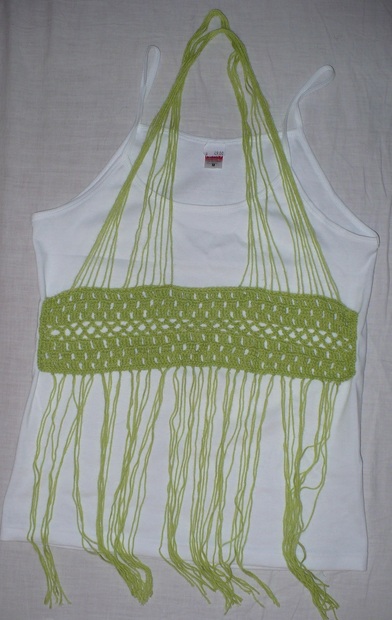 Bílé tílko bylo poněkud nudné, tak jsem jej ozdobila zelenou háčkovanou aplikací.