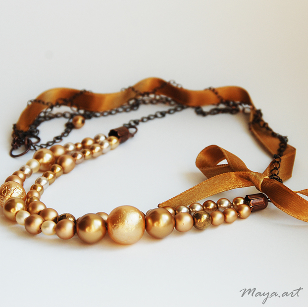 náhrdelník ze zlatých voskovaných korálků a zlato-hnědé stužky doplněný o měděné komponenty