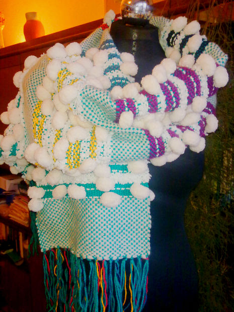 Tkaná šála z různých akrylových přízí v kombinaci s měkoučkou bambulkovou. Veselá