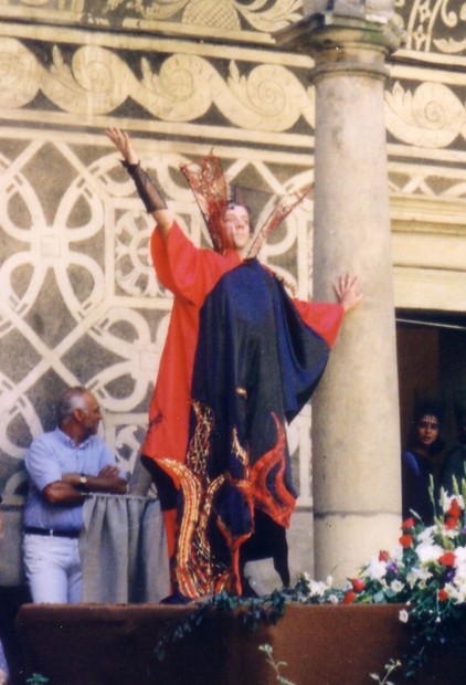 Celý kostým na přehlídce na Doudlebském zámku. Autorky: maska a rukavice - Lenka Veselá, plášť - Zdena Suchomelová