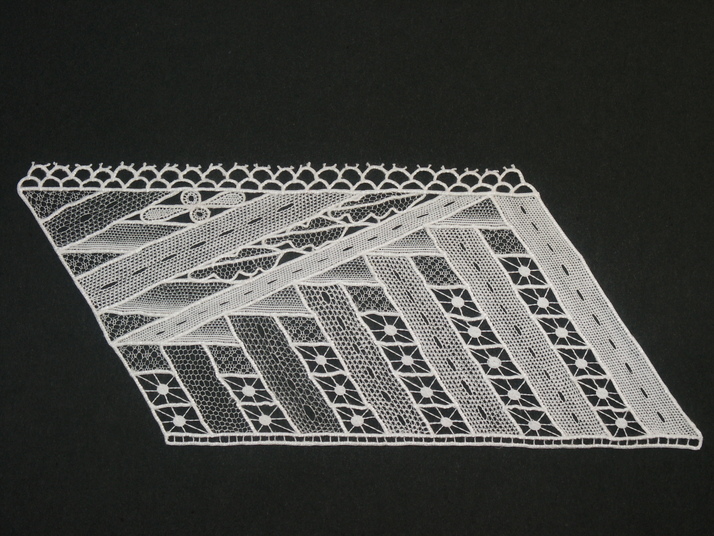 Jako ročníkovou práci při studiu restaurování textilií jsem vytvořila kopii poškozené šité krajky. Rozměry: cca 16x8 cm, materiál: lněné belgické nitě